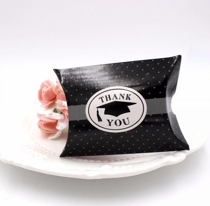 These adorable gift boxes are perfect for celebrating your graduation. These small boxes can hold lollies, gifts, or chocolates. The boxes arrive flat so all you need to do is fold them into place and start filling them with goodies. The design includes a spotted black and white background, a silver ribbon and a ‘Thank You’ message with a graduation cap in the middle.