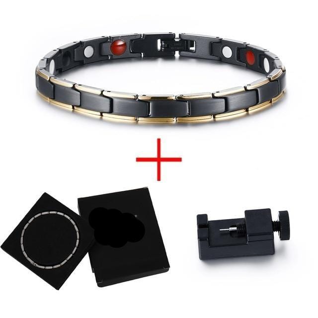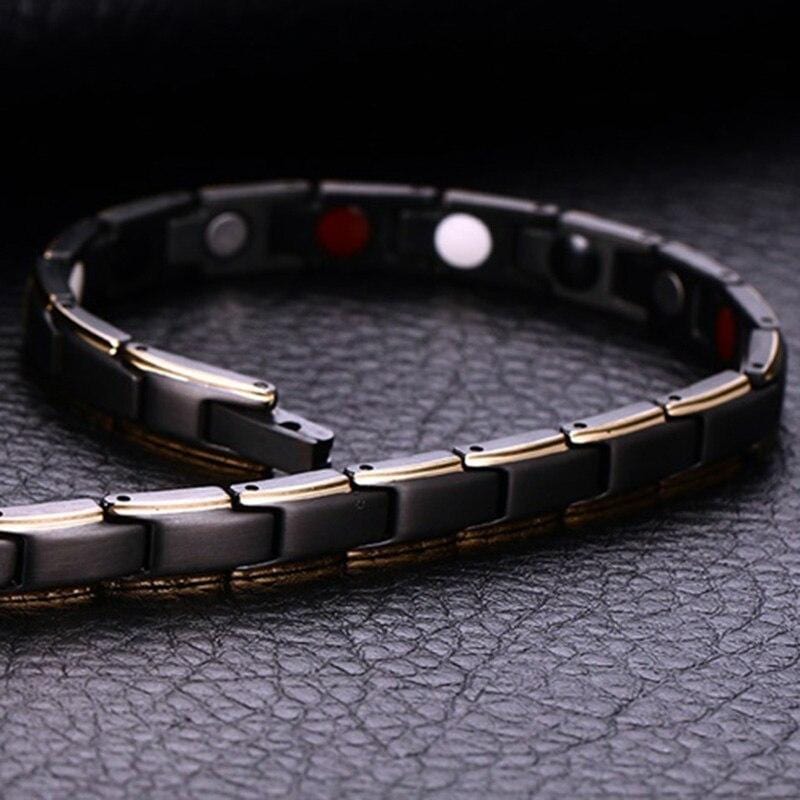 Elegant Adjustable Link Bracelet in Black with Gold Trim featuring magnetic, far infrared, germanium and negatively ionized plates.