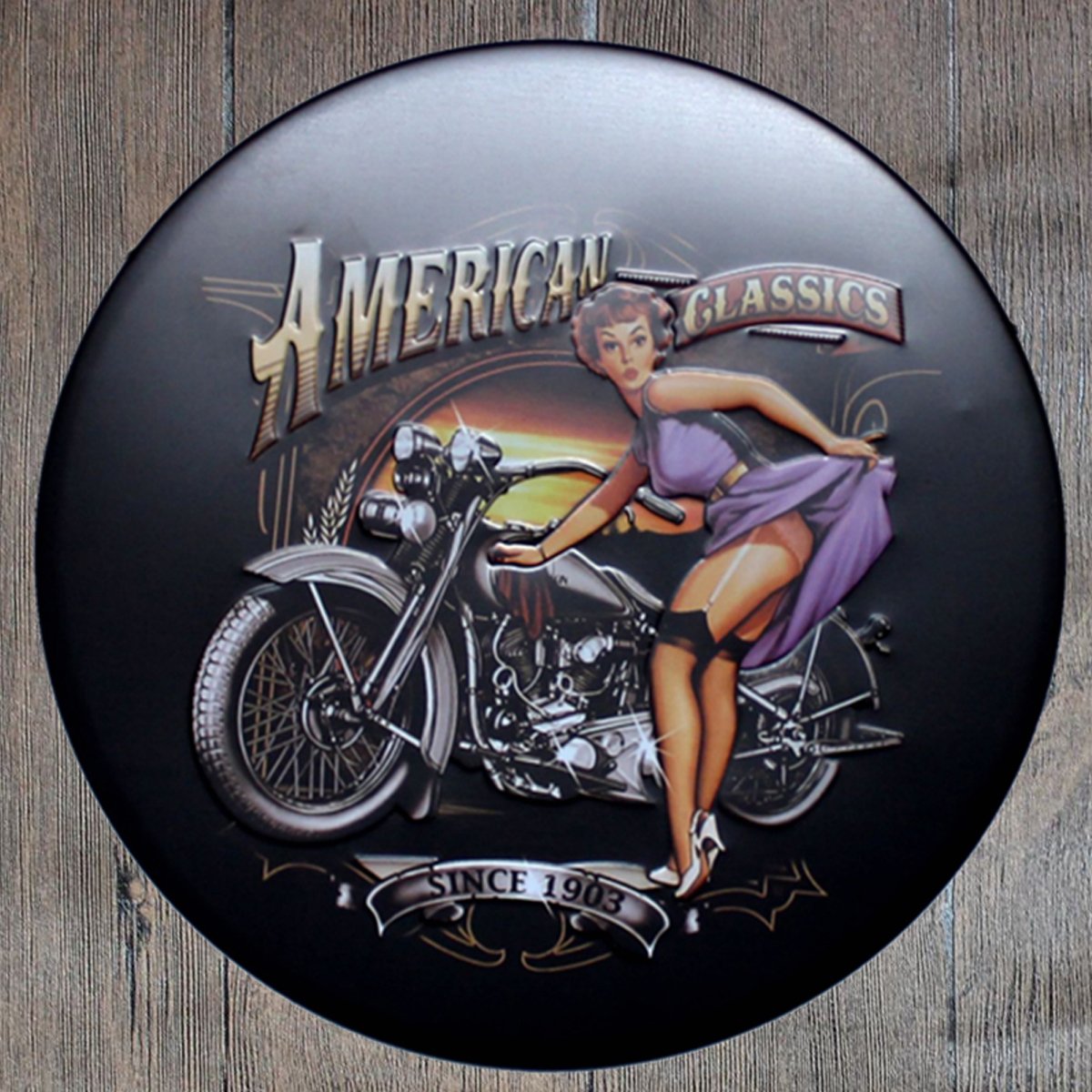 American Classics Round Metal Tin Sign Poster will adorn the look and feel of your wall. This versatile and durable tin sign, metal wall poster can be stuck in any corner of your room, office, shop, shed, garage or store and it will look just as great. Imported Iron. Fashion & Retro Quality Tinned Skin. Four pre-drilled holes for hanging or you may use double-sided tape.
