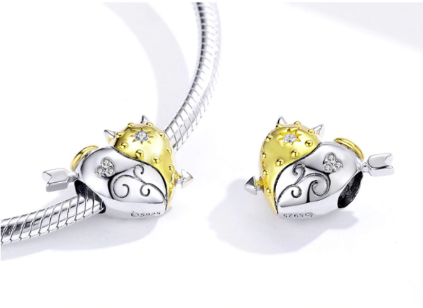 Angel and Devil Heart Charm. Be daring and add something completely unique to your jewellery collection. The two tone heart charm is sure to make a statement with little details like a cupid's arrow, an angel's halo and devil horns. The charm also has some added sparkle with the addition of two brilliant cubic zirconia crystals.