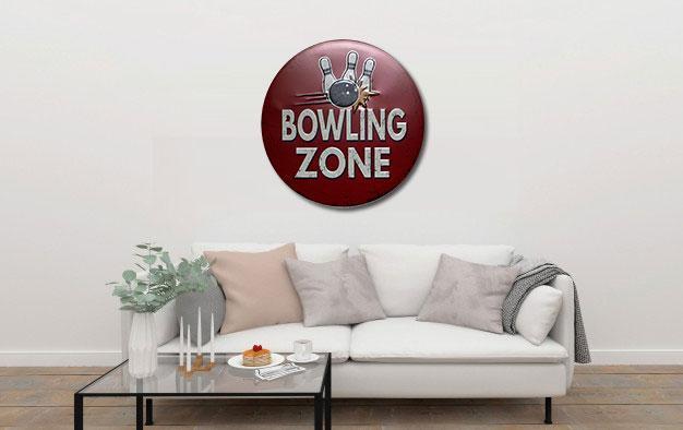 Bowling Zone Round Metal Tin Sign Poster will adorn the look and feel of your wall. This versatile and durable tin sign, metal wall poster can be stuck in any corner of your room, office, shop, shed, garage or store and it will look just as great. Imported Iron. Fashion & Retro Quality Tinned Skin. Four pre-drilled holes for hanging or you may use double-sided tape.