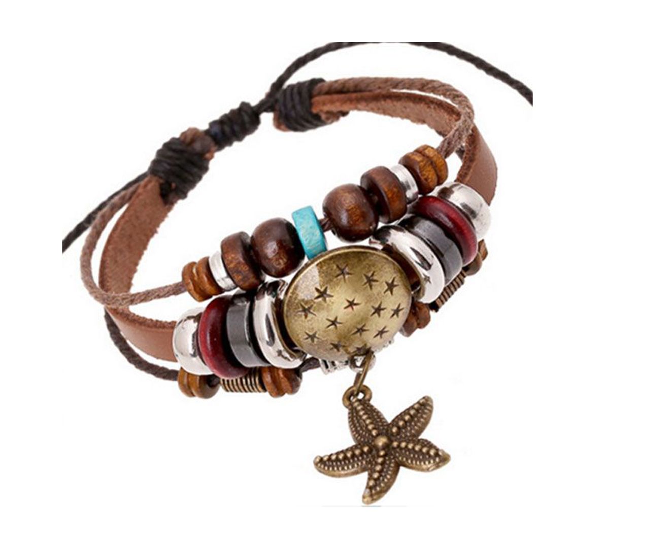 Brown Bronze Sea Star Leather Bracelets for Wome- Retro leather bronze sea star round shield stud bracelet for women is a brown colored triple layered bracelet that is designed using genuine leather. It is hand crafted and composed of wooden beads that are tied together in a lace-up rope closure. The clasp is flexible in size and can be adjusted in accordance with the size of the wrist. Star-studded in the center of the bracelet adds to the appeal and look of it.