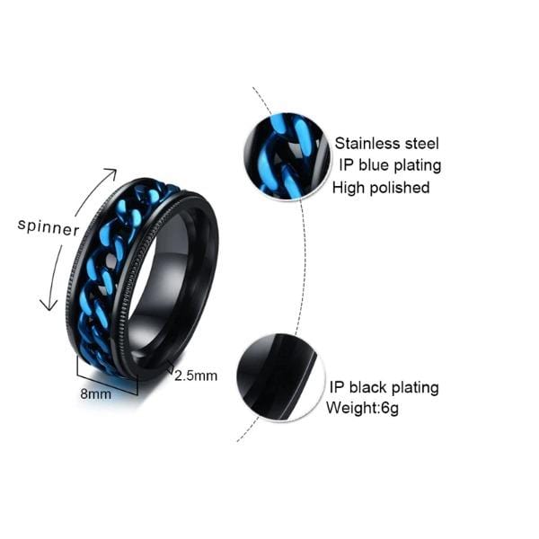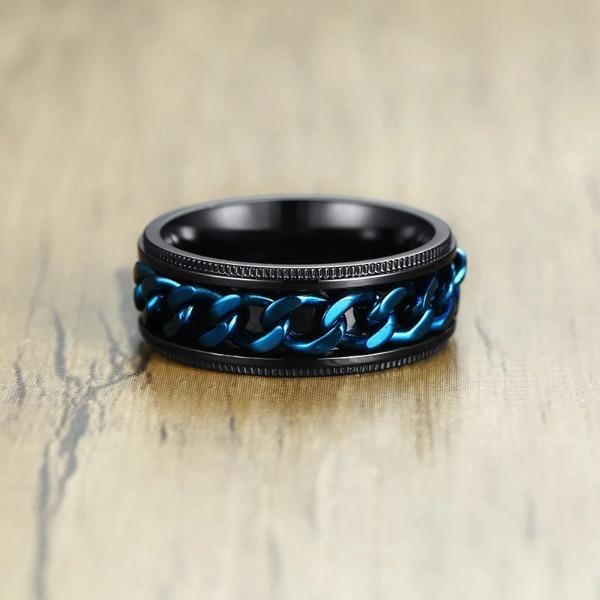 Featuring hues of electric blue and black this striking ring will add masculine elegance to any outfit; casual or formal. Made from durable Stainless Steel, this ring is resistant to rust, tarnishing and is lightweight. The blue chain also give the ring an interesting look.