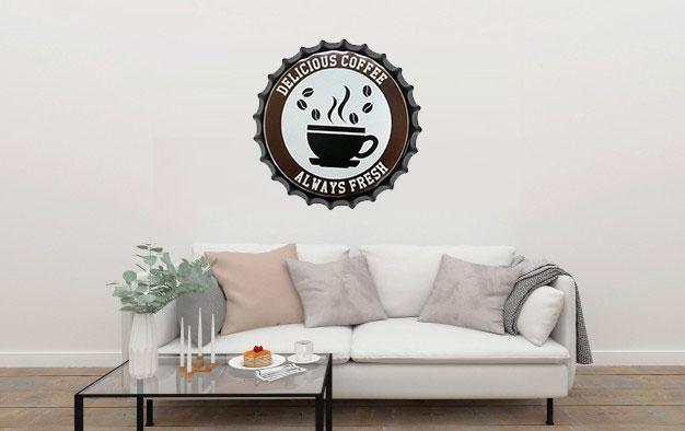 Delicious Coffee Beer Cap Metal Tin Sign Poster will adorn the look and feel of your wall. This versatile and durable tin sign, metal wall poster can be stuck in any corner of your room, office, shop, shed, garage or store and it will look just as great. Imported Iron. Fashion & Retro Quality Tinned Skin. Four pre-drilled holes for hanging or you may use double-sided tape.