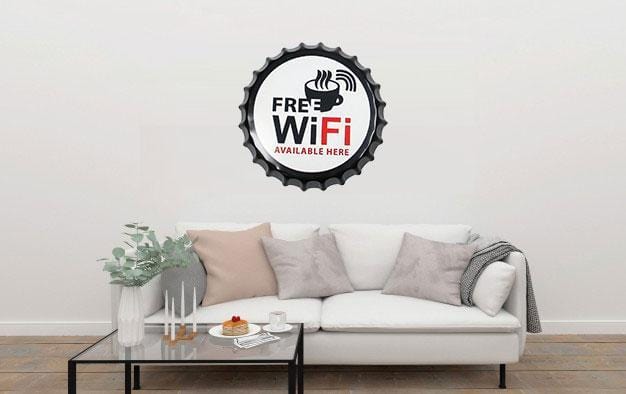 Free WI-FI Available Here Beer Cap Metal Tin Sign Poster will adorn the look and feel of your wall. This versatile and durable tin sign, metal wall poster can be stuck in any corner of your room, office, shop, shed, garage or store and it will look just as great. Imported Iron. Fashion & Retro Quality Tinned Skin. Four pre-drilled holes for hanging or you may use double-sided tape.