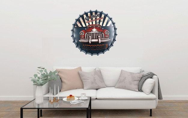 Garage Automobile Beer Cap Metal Tin Sign Poster will adorn the look and feel of your wall. This versatile and durable tin sign, metal wall poster can be stuck in any corner of your room, office, shop, shed, garage or store and it will look just as great. Imported Iron. Fashion & Retro Quality Tinned Skin. Four pre-drilled holes for hanging or you may use double-sided tape.