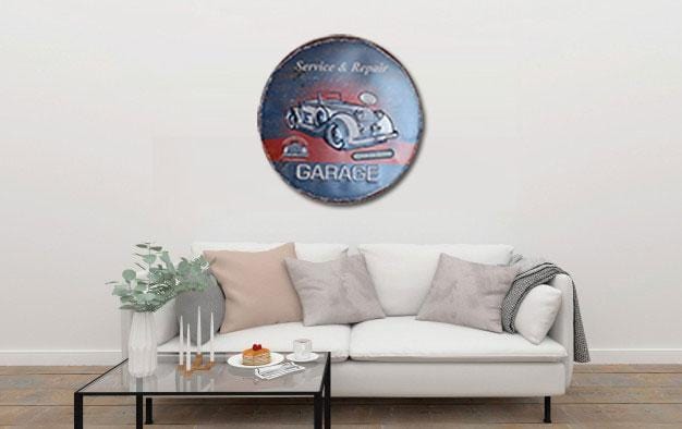 Garage Service & Repair Round Metal Tin Sign Poster will adorn the look and feel of your wall. This versatile and durable tin sign, metal wall poster can be stuck in any corner of your room, office, shop, shed, garage or store and it will look just as great. Imported Iron. Fashion & Retro Quality Tinned Skin. Four pre-drilled holes for hanging or you may use double-sided tape.