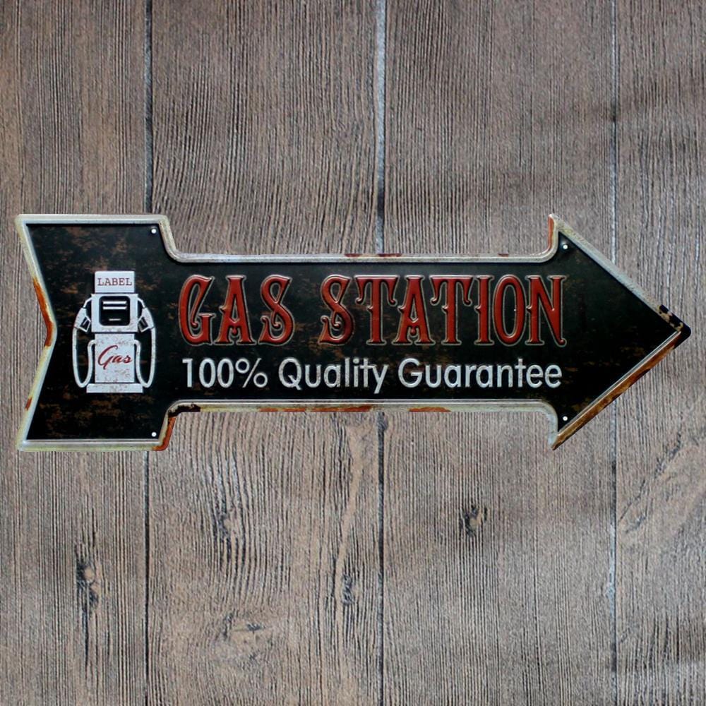 Gas Station Arrow Metal Tin Sign Poster will adorn the look and feel of your wall. This versatile and durable tin sign, metal wall poster can be stuck in any corner of your room, office, shop, shed, garage or store and it will look just as great. Imported Iron. Fashion & Retro Quality Tinned Skin. Four pre-drilled holes for hanging or you may use double-sided tape.