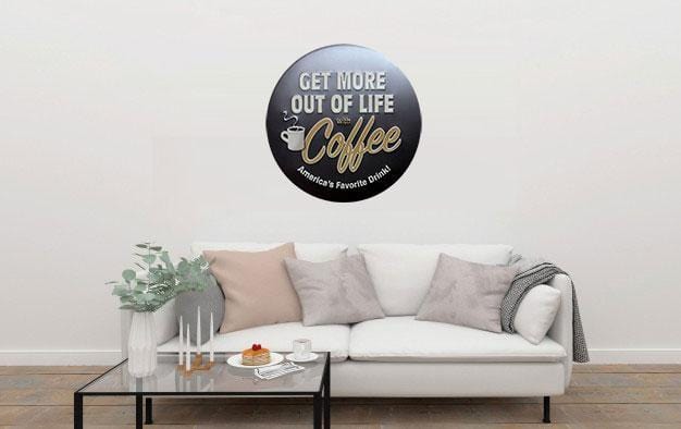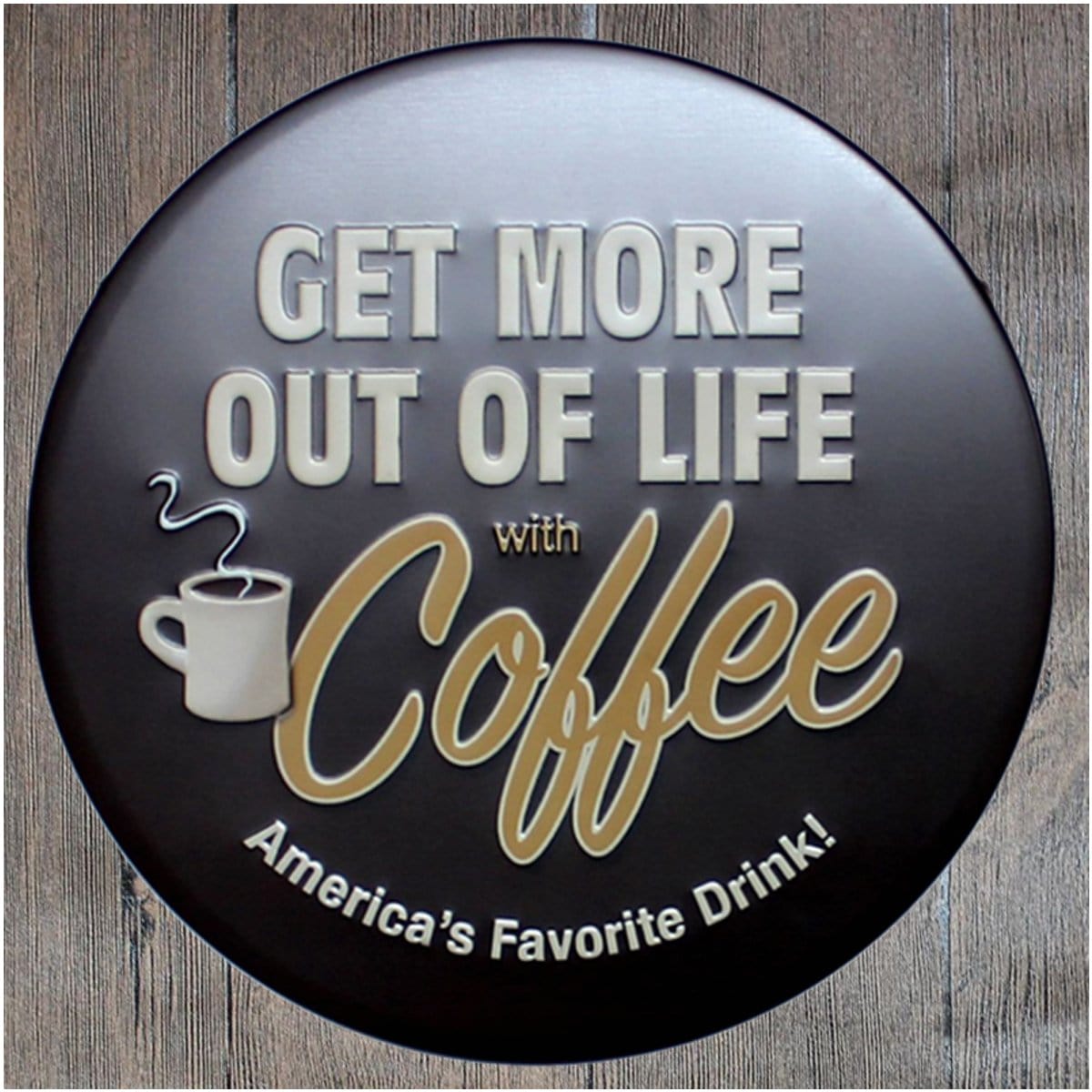 Get More Out of Life With Coffee Round Metal Tin Sign Poster will adorn the look and feel of your wall. This versatile and durable tin sign, metal wall poster can be stuck in any corner of your room, office, shop, shed, garage or store and it will look just as great. Imported Iron. Fashion & Retro Quality Tinned Skin. Four pre-drilled holes for hanging or you may use double-sided tape.
