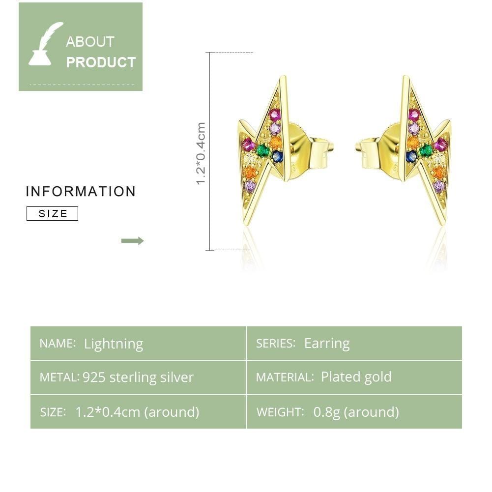 Gold Flash Stud Earrings. Add a pop of colour to your next outfit with these gorgeous gold flash earrings. Crafted into the shape of a lightning bolt the electric looking earrings are studded with a number of multi-colored gemstones whilst being plated with gold. As a base the earring use sterling silver, making them durable, resistant to rast and lightweight.