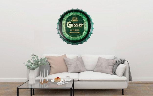Gosser Beer Cap Metal Tin Sign Poster will adorn the look and feel of your wall. This versatile and durable tin sign, metal wall poster can be stuck in any corner of your room, office, shop, shed, garage or store and it will look just as great. Imported Iron. Fashion & Retro Quality Tinned Skin. Four pre-drilled holes for hanging or you may use double-sided tape.