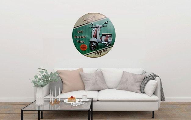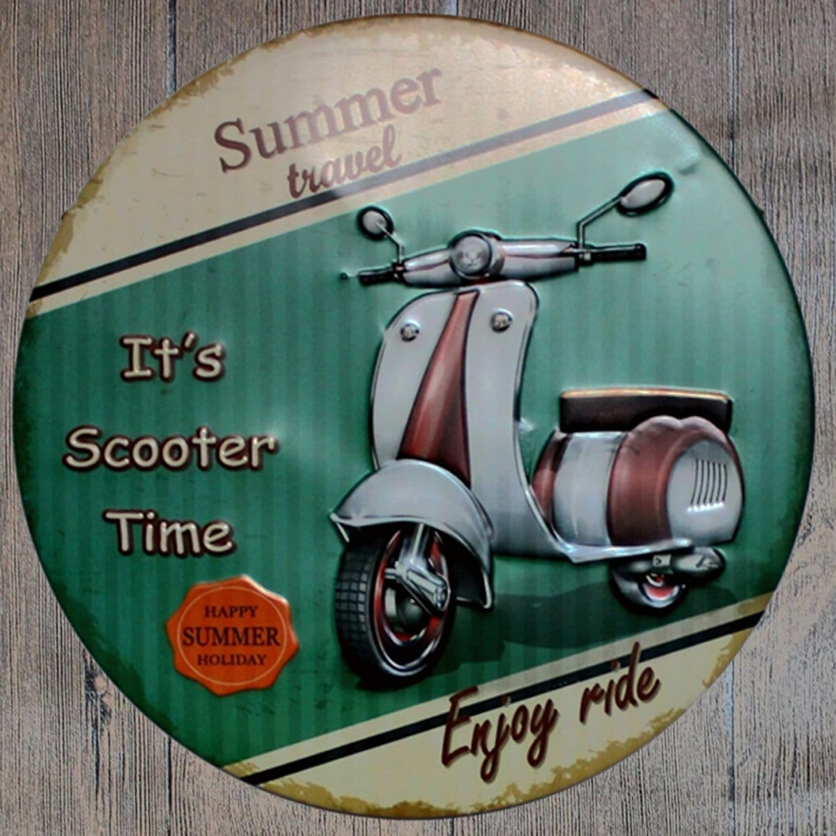 Its Scooter Time Round Metal Tin Sign Poster will adorn the look and feel of your wall. This versatile and durable tin sign, metal wall poster can be stuck in any corner of your room, office, shop, shed, garage or store and it will look just as great. Imported Iron. Fashion & Retro Quality Tinned Skin. Four pre-drilled holes for hanging or you may use double-sided tape.