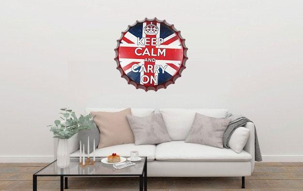 Keep Calm & Carry On round bottle Beer Cap Metal Tin Sign Poster will adorn the look and feel of your wall. This versatile and durable tin sign, metal wall poster can be stuck in any corner of your room, office, shop, shed, garage or store and it will look just as great. Imported Iron. Fashion & Retro Quality Tinned Skin. Four pre-drilled holes for hanging or you may use double-sided tape.