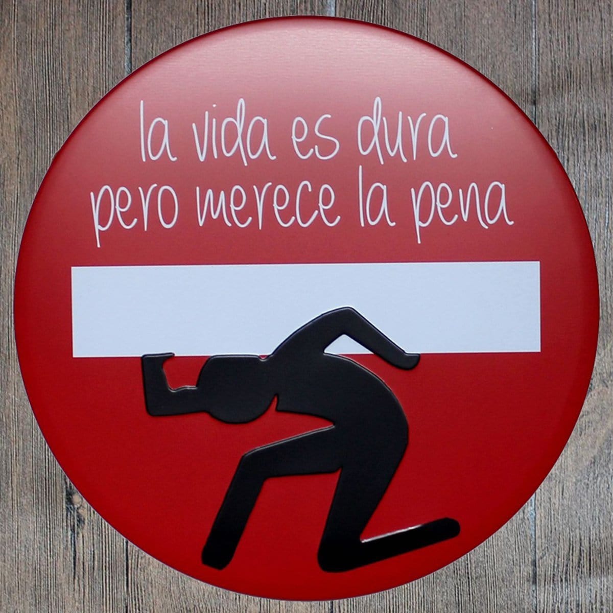 La Vida Es Dura Round Metal Tin Sign Poster will adorn the look and feel of your wall. This versatile and durable tin sign, metal wall poster can be stuck in any corner of your room, office, shop, shed, garage or store and it will look just as great. Imported Iron. Fashion & Retro Quality Tinned Skin. Four pre-drilled holes for hanging or you may use double-sided tape.