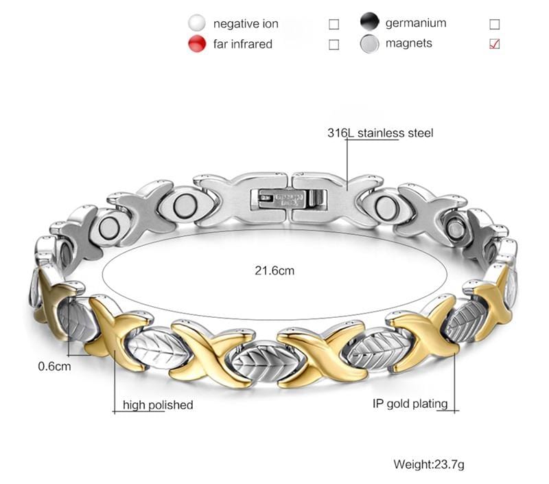 Our uniquely patterned magnetic linked bracelet for Women has a striking cross pattern , creating a different design from most on the market, complete with magnetised, far infrared, germanium and negatively ionised plates. This stylishly designed magnetic therapy bracelet has magnetic inserts on the inner to bring health benefits to the wearer,reported benefits of magnetic bracelets includes Improved blood circulation, and also helpful in certain conditions, such as arthritis and insomnia. However you should not go for magnetic therapy if you are on a pacemaker, or have an insulin pump attached to your body . We also send one tool for adjusting length of this bracelet. This layered stainless steel Adjustable Link Bracelet makes a powerful statement while also having the benefits of negative ions, magnetic, germanium and far infrared inner plates.