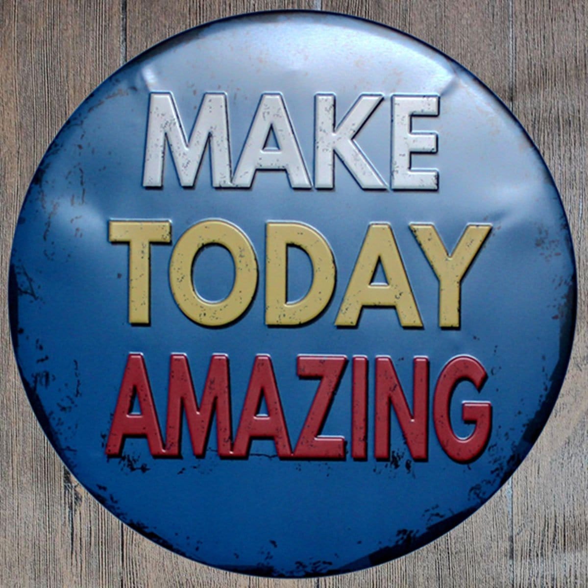 Make Today Amazing Round Metal Tin Sign Poster will adorn the look and feel of your wall. This versatile and durable tin sign, metal wall poster can be stuck in any corner of your room, office, shop, shed, garage or store and it will look just as great. Imported Iron. Fashion & Retro Quality Tinned Skin. Four pre-drilled holes for hanging or you may use double-sided tape.