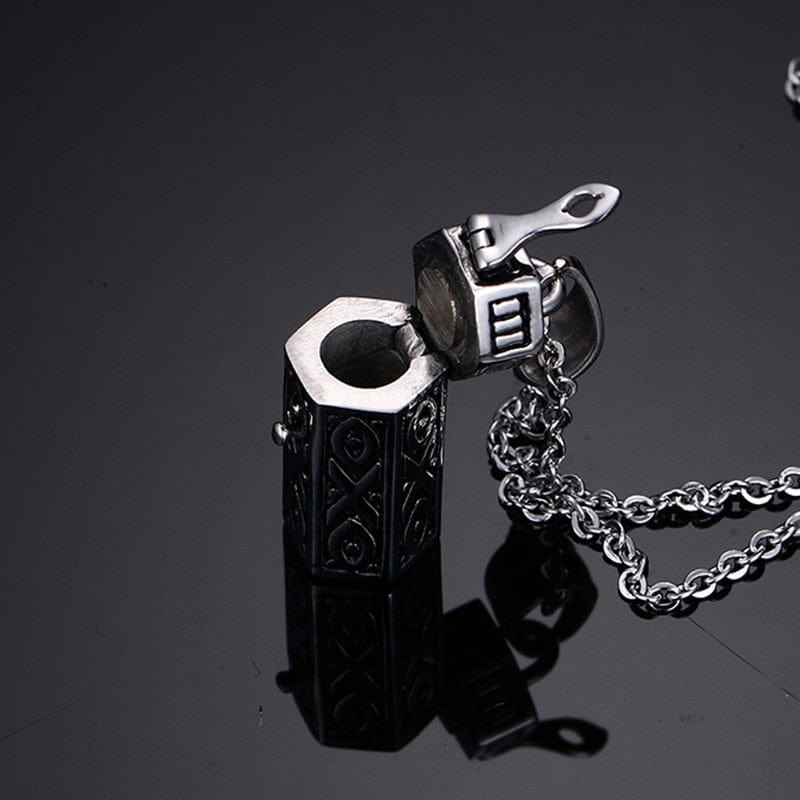 Has a small opening to place a small amount of cremation ashes or a tiny lock of hair or fur, anything symbolic to you. It is subtle and looks beautiful on.
