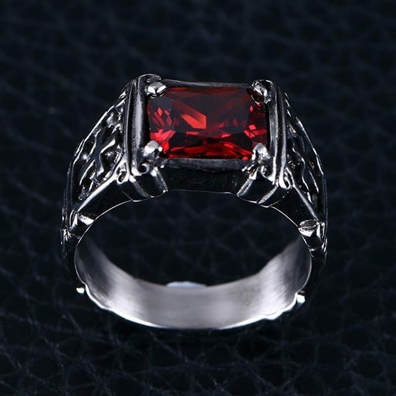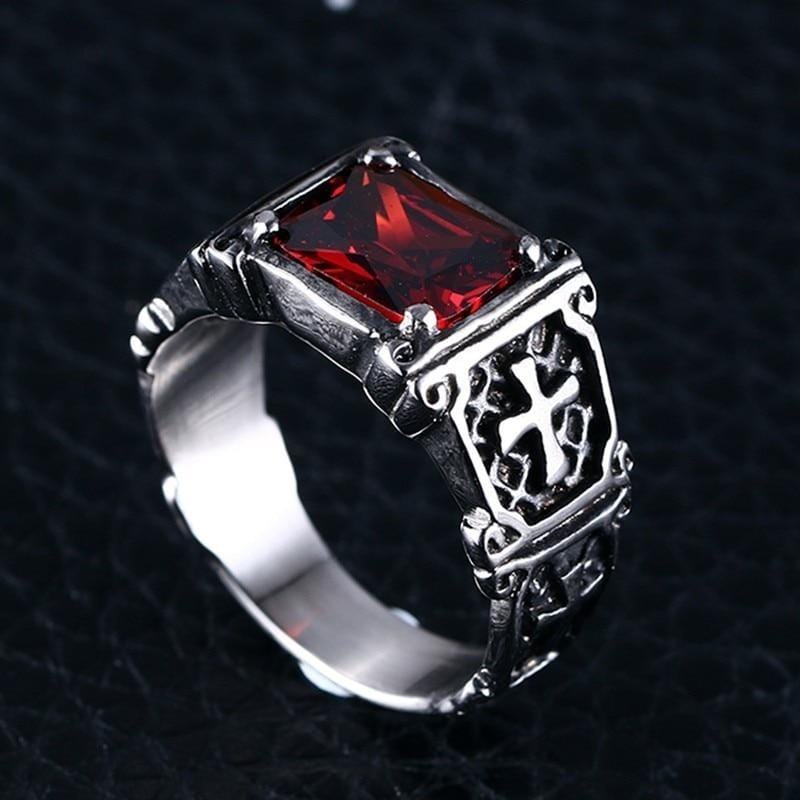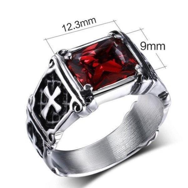 Turn heads with this edgy silver cross ring. This gorgeous ring features a sparkling ruby red gemstone at it's centre which is shouldered by intricate design details including two gothic crosses. The ring also features oxidised detailing to give it a more aged look.