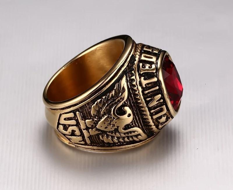 Feeling patriotic, why not add this US style Navy ring to your collection. The thick ring band is intricately engraved and features golden eagles, navy text and an oxidised finish for that vintage look. The ring also features a sparkling semi-precious stone at its heart for that extra bit of bling.