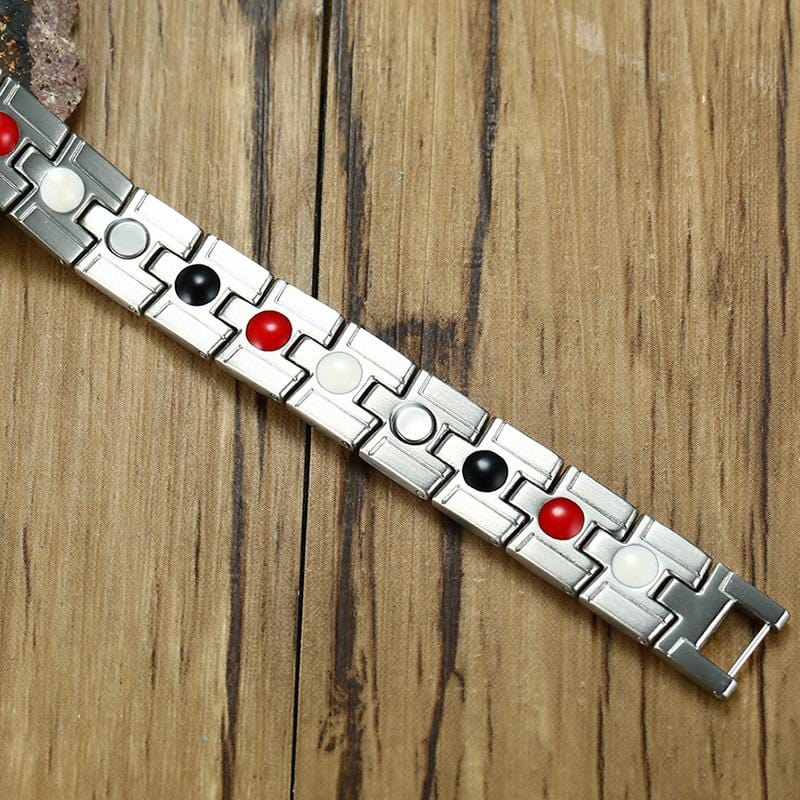 Our uniquely patterned magnetic linked bracelet for Mens has a striking cross pattern , creating a different design from most on the market, complete with magnetised, far infrared, germanium and negatively ionised plates. This stylishly designed magnetic therapy bracelet has magnetic inserts on the inner to bring health benefits to the wearer,reported benefits of magnetic bracelets includes Improved blood circulation, and also helpful in certain conditions, such as arthritis and insomnia. However you should not go for magnetic therapy if you are on a pacemaker, or have an insulin pump attached to your body . We also send one tool for adjusting length of this bracelet. This layered stainless steel Adjustable Link Bracelet makes a powerful statement while also having the benefits of negative ions, magnetic, germanium and far infrared inner plates.