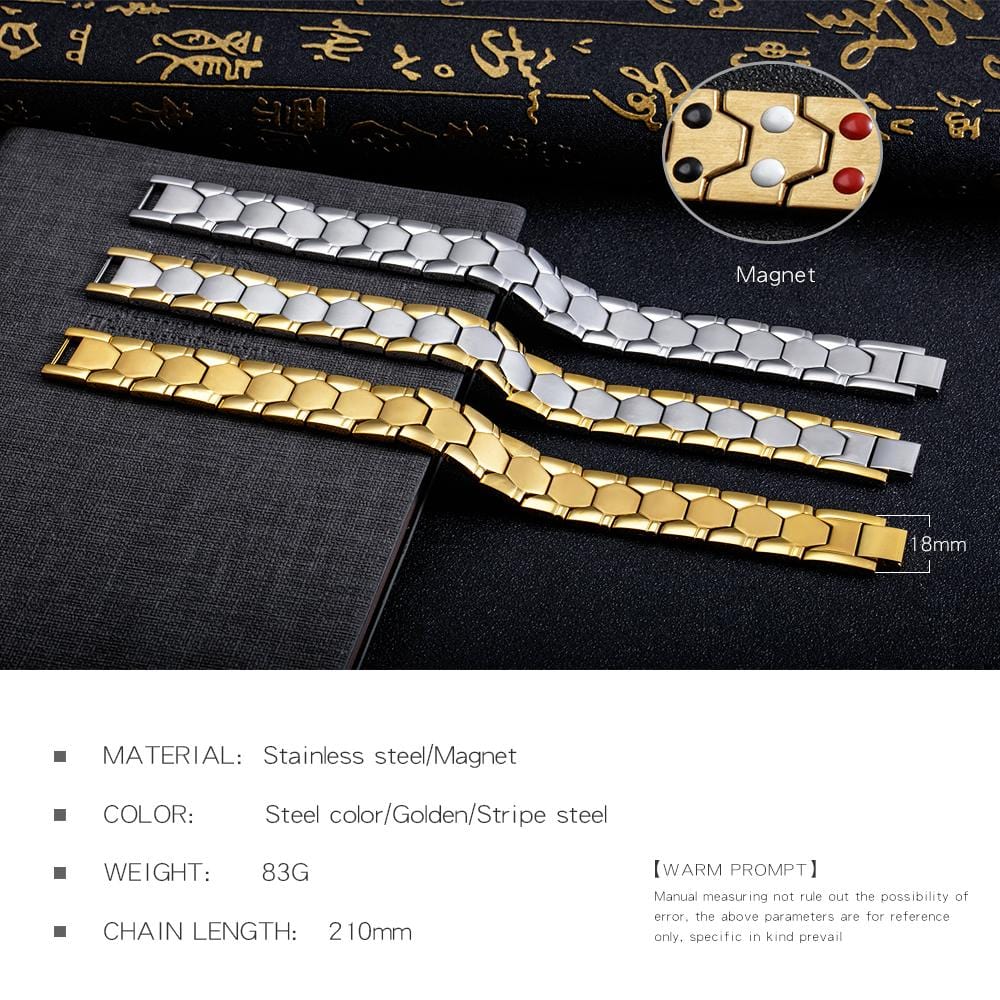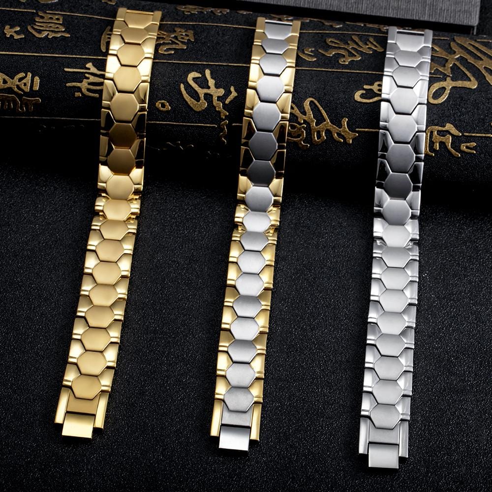 Our uniquely patterned magnetic linked bracelet for Mens has a striking cross pattern , creating a different design from most on the market, complete with magnetised, far infrared, germanium and negatively ionised plates. This stylishly designed magnetic therapy bracelet has magnetic inserts on the inner to bring health benefits to the wearer,reported benefits of magnetic bracelets includes Improved blood circulation, and also helpful in certain conditions, such as arthritis and insomnia. However you should not go for magnetic therapy if you are on a pacemaker, or have an insulin pump attached to your body . We also send one tool for adjusting length of this bracelet. This layered stainless steel Adjustable Link Bracelet makes a powerful statement while also having the benefits of negative ions, magnetic, germanium and far infrared inner plates.