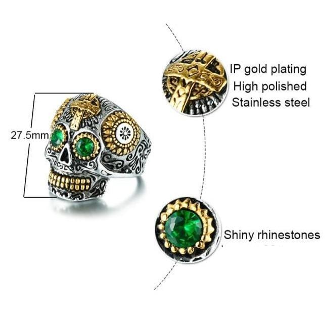Add some bling your ensemble with this flamboyant Mexican sugar skull ring. The ring features a 'Day of the Dead' style skull design, intricately crafted and engraved using tones of gold and silver. A bright bit of sparkle is added to the ring with two brilliant green zirconias placed within the skulls eye sockets.