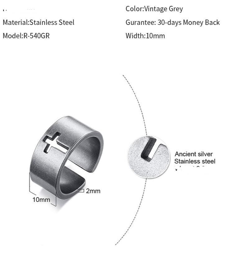 This stainless steel cross ring has a edgy yet modern look and is perfect for pairing with a number of different fashion looks, The ring is adjustable, making it a perfect fit for any finger and the base material of stainless steel is durable, hypoallergenic and resistant to rust and corrosion.