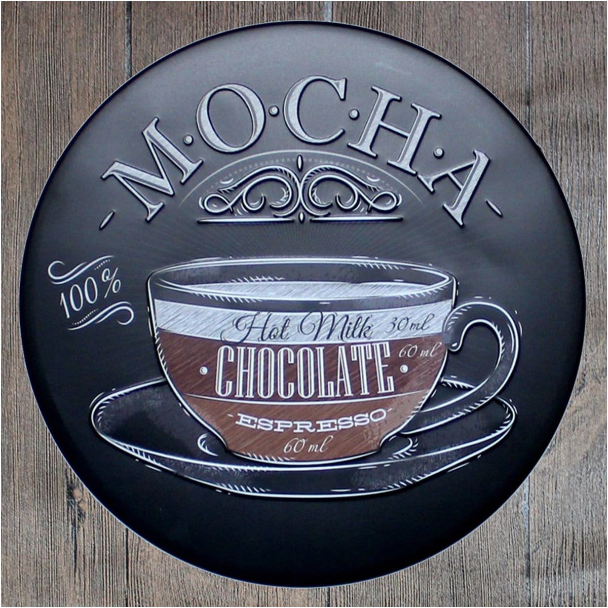 Mocha Chocolate Round Metal Tin Sign Poster will adorn the look and feel of your wall. This versatile and durable tin sign, metal wall poster can be stuck in any corner of your room, office, shop, shed, garage or store and it will look just as great. Imported Iron. Fashion & Retro Quality Tinned Skin. Four pre-drilled holes for hanging or you may use double-sided tape.