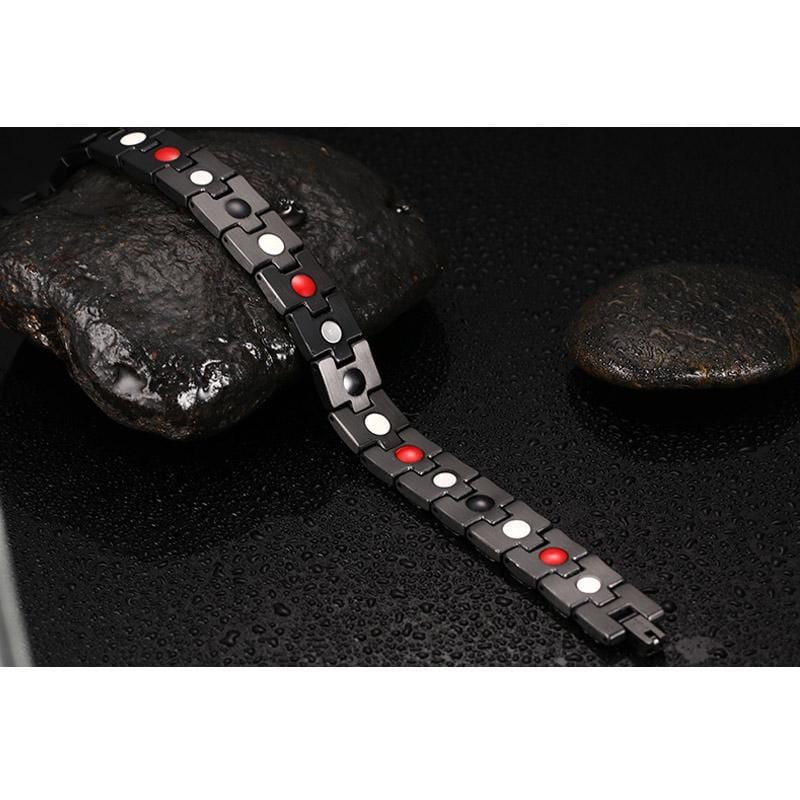 Our uniquely patterned magnetic linked bracelet for Mens has a striking cross pattern , creating a different design from most on the market, complete with magnetised, far infrared, germanium and negatively ionised plates. This stylishly designed magnetic therapy bracelet has magnetic inserts on the inner to bring health benefits to the wearer,reported benefits of magnetic bracelets includes Improved blood circulation, and also helpful in certain conditions, such as arthritis and insomnia. However you should not go for magnetic therapy if you are on a pacemaker, or have an insulin pump attached to your body . We also send one tool for adjusting length of this bracelet. This layered stainless steel Adjustable Link Bracelet makes a powerful statement while also having the benefits of negative ions, magnetic, germanium and far infrared inner plates.