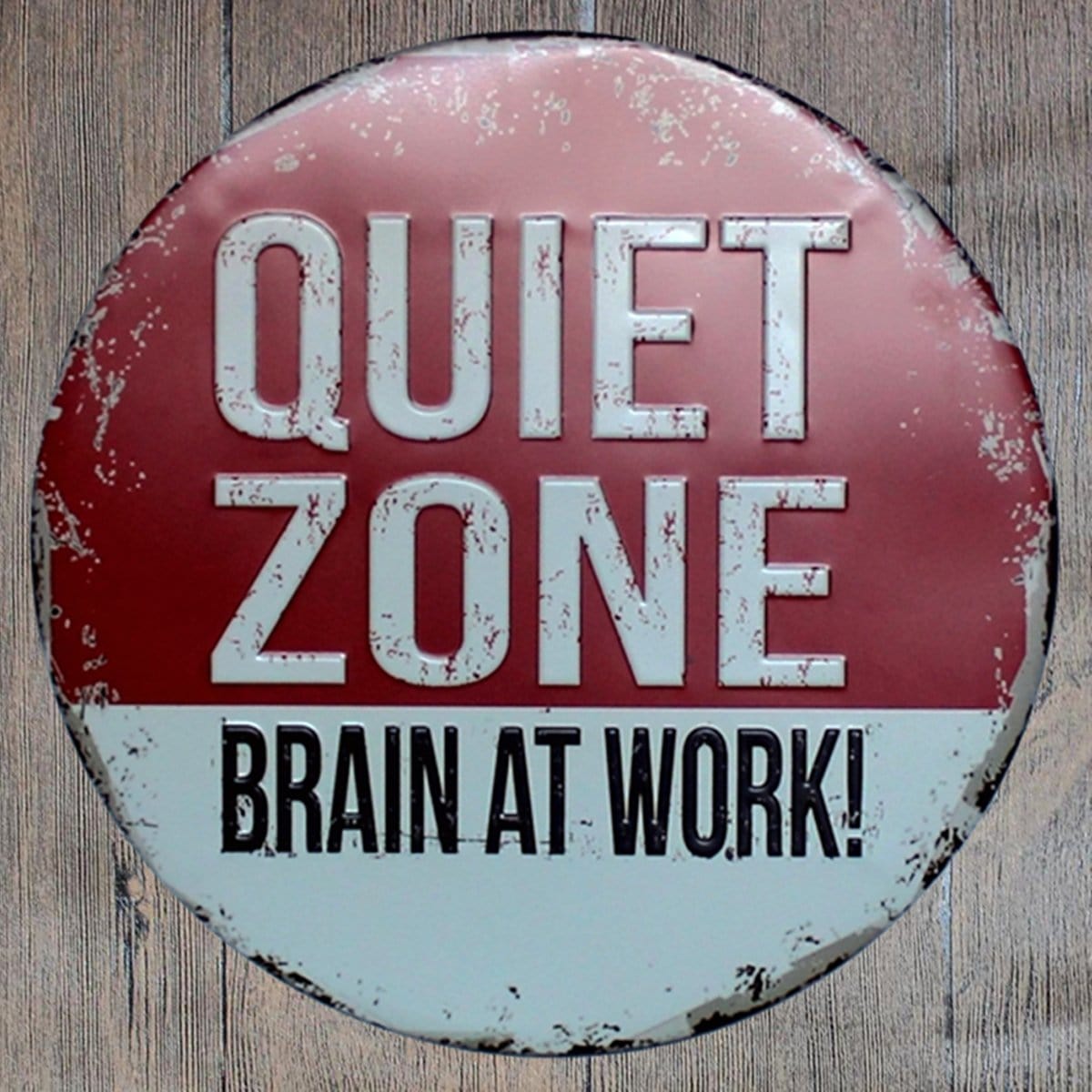 Quiet Zone Brain At Work Round Metal Tin Sign Poster will adorn the look and feel of your wall. This versatile and durable tin sign, metal wall poster can be stuck in any corner of your room, office, shop, shed, garage or store and it will look just as great. Imported Iron. Fashion & Retro Quality Tinned Skin. Four pre-drilled holes for hanging or you may use double-sided tape.
