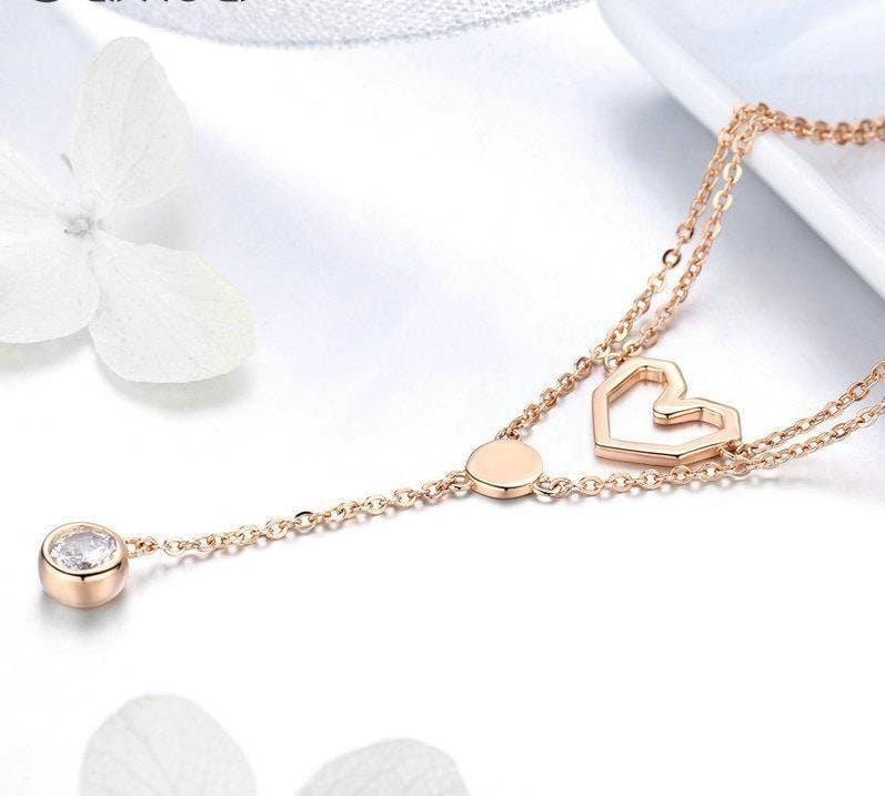 Rose Gold Geometric Heart Necklace. Fashionable and modern, this gorgeous geometric heart necklace features a fashionable double chain and a dangling cubic zirconia charm. Made using a base of sterling silver, this necklace is durable and resistant to corrosion.