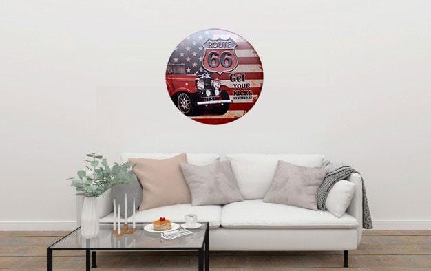 Route 66 Round Metal Tin Sign Poster will adorn the look and feel of your wall. This versatile and durable tin sign, metal wall poster can be stuck in any corner of your room, office, shop, shed, garage or store and it will look just as great. Imported Iron. Fashion & Retro Quality Tinned Skin. Four pre-drilled holes for hanging or you may use double-sided tape.
