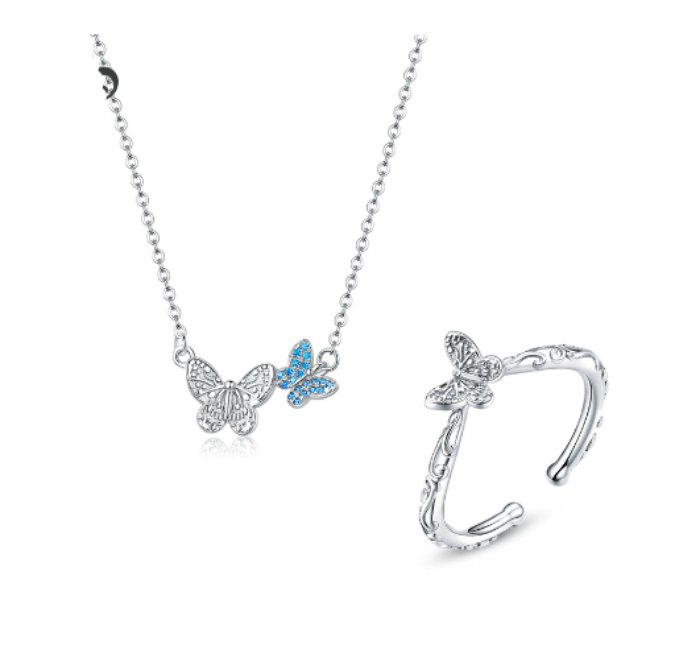 Silver Butterfly Necklace Set. Treat yourself with this beautiful sterling silver butterfly necklace and ring set. Two embellished butterflies seamlessly flutter at the centre of a durable sterling silver link chain; one butterfly is engraved with subtle silver detailing whilst the other shines bright with ocean blue cubic zirconias. The accompanying ring features an oxidized finish with intricate detailing, giving the ring a rustic, vintage edge.