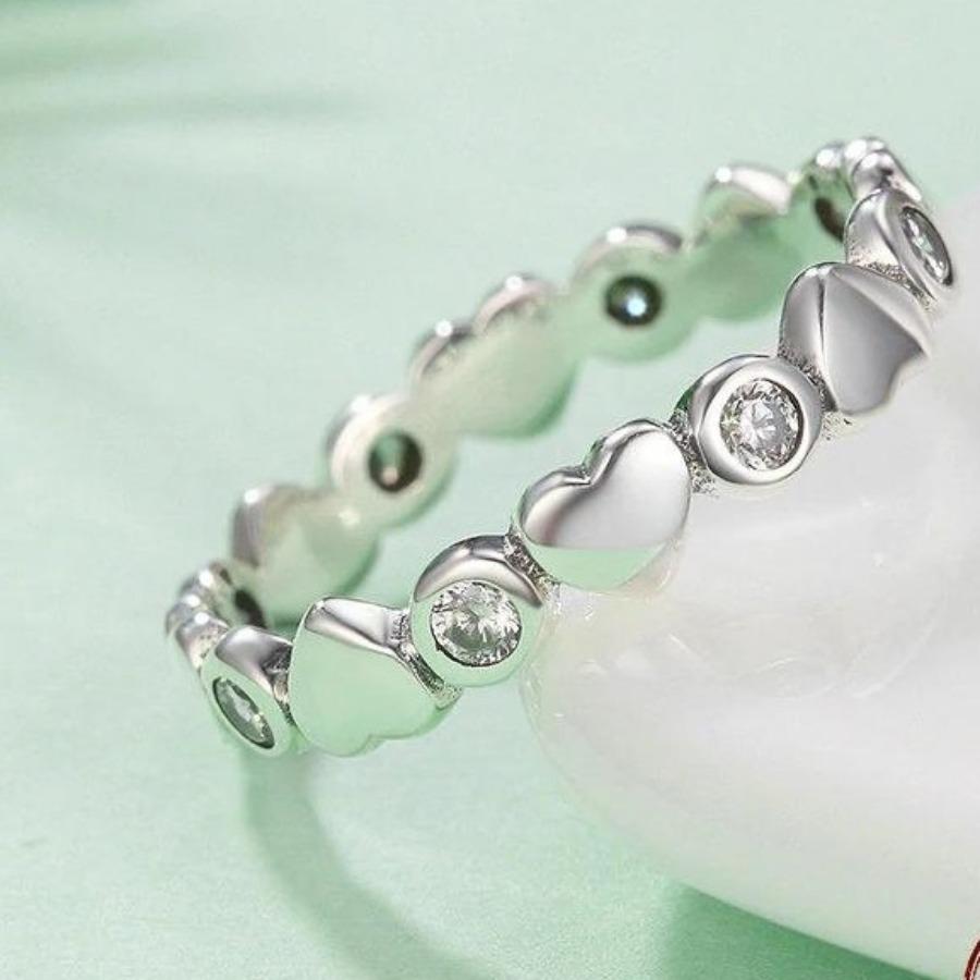 Silver Cheap Engagement Ring. Simple and classy, this glittering heart engagement band is features an elegant matrimonial design; perfect for saying 'I Do'. The band itself features encrusted cubic zirconias, interspersed amongst glistening silver hearts, adding a romantic look and feel to this beautiful ring. Made using high-polish sterling silver this band is durable and has anti-tarnish properties.