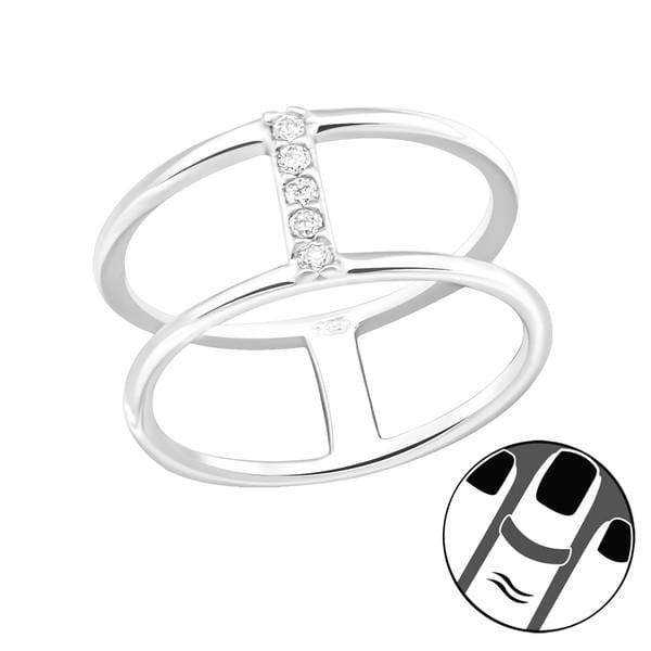 A unique silver and clear sparkling cubic zirconia midi ring, featuring a row of five shining stones down the centre line and two separate fine silver bands to compliment your hand beautifully.