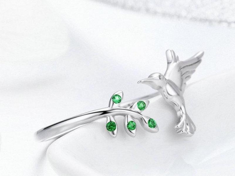Silver Hummingbird Ring. Add a natural edge to your outfit with this wrap around hummingbird ring. Crafted using high-polish sterling silver, this gorgeous ring is studded with emerald green crystal gemstones; adding an element of sparkle to an already lustrous design. This ring is versatile and can be paired with everyday ensemble or more formal outfits.