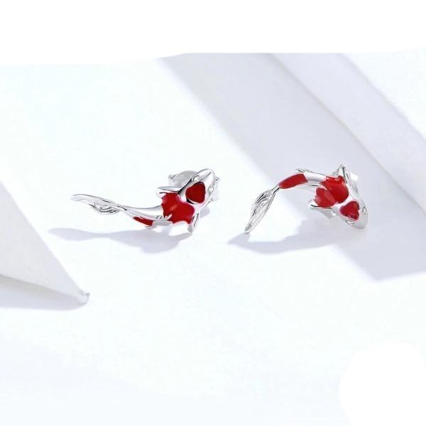 Stand out from the crowd with a set of stunning sterling silver studs featuring the elegant design of two majestic koi fish. This set has a unique Asian twist, featuring a lucky shade of red and two diamante studs. These earrings make a great gift for the animal lover in your life and will add a bit of uniqueness to any modern ensemble.