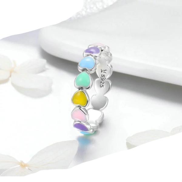 Add a little bit of fun to your outfit with this sterling silver hearts ring. While the ring features a base of sterling silver it overflows with colour with its pastel painted hearts. Kitschy and cute this ring is perfect for someone with an alternate style or someone wanting to add some colour to their ring collection.