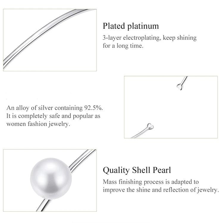 Quaint and elegant Silver Pearl Open Bangle, featuring a fine bracelet with heart shaped silver ends and a bright white pearl setting centrepiece.