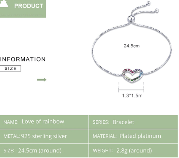 Features : Silver Rainbow Heart Bracelet comes with an elegantly designed and sturdy gift box that is ideal for storing and presenting jewellery.