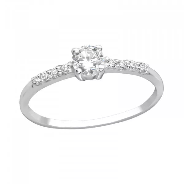 A striking and elegant silver ring featuring a stunning cubic zirconia and is encrusted with many smaller zirconias on the band. Made with genuine sterling silver the ring is resistant to corrosion, tarnishing, and rust.