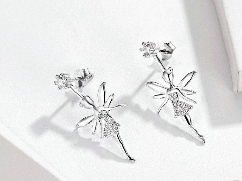 Sparkling Fairy Drop Earrings. Give your outfits a magical touch with this set of glittering fairy drop earrings. The earrings feature a simple cubic zirconia stud with a sleek drop down fairy design. Adding tho the shine, the fairy's outfit is studded with sparkling crystals.