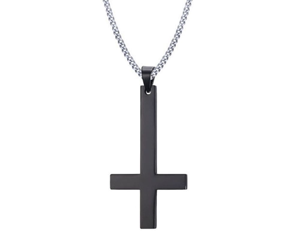 This edgy inverted cross necklace is sure to turn heads with its grungy design and silver link chain. The necklace is made of stainless steel and is available in gold, black, and silver. Stainless steel is durable and resistant to rust or corrosion.