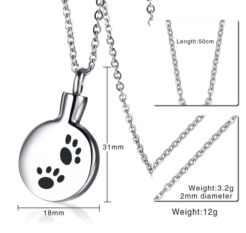 Features:Stainless Steel Dog Paw Print Cremation Jewelry Keepsake Memorial Urn Necklace Comes with an elegantly designed and sturdy gift box that is ideal for storing and presenting jewellery.