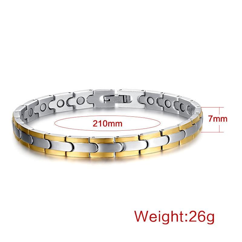 Our uniquely patterned magnetic linked bracelet for Women has a striking cross pattern , creating a different design from most on the market, complete with magnetised, far infrared, germanium and negatively ionised plates. This stylishly designed magnetic therapy bracelet has magnetic inserts on the inner to bring health benefits to the wearer,reported benefits of magnetic bracelets includes Improved blood circulation, and also helpful in certain conditions, such as arthritis and insomnia. However you should not go for magnetic therapy if you are on a pacemaker, or have an insulin pump attached to your body . We also send one tool for adjusting length of this bracelet. This layered stainless steel Adjustable Link Bracelet makes a powerful statement while also having the benefits of negative ions, magnetic, germanium and far infrared inner plates.