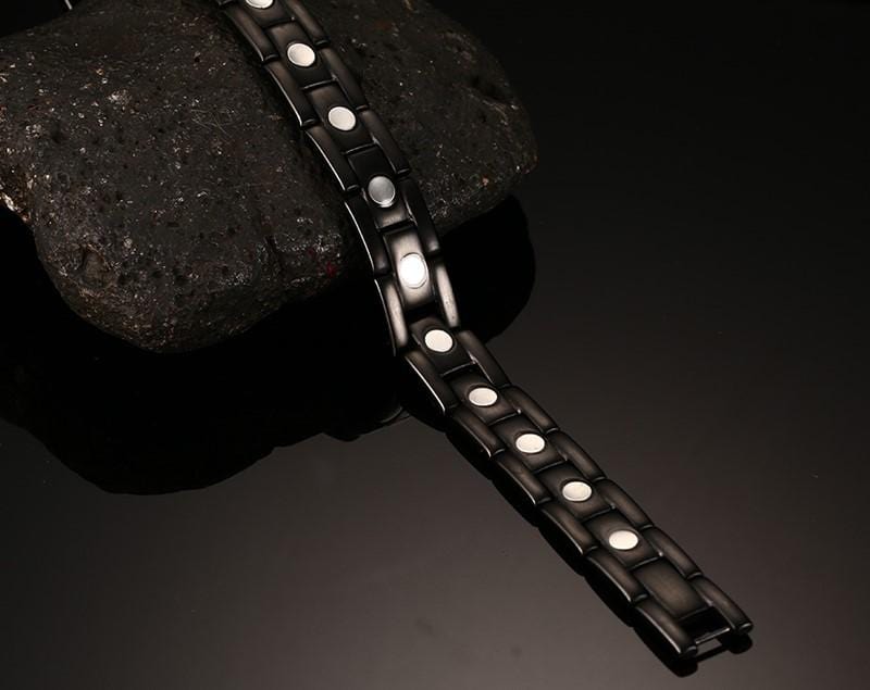 Our uniquely patterned magnetic linked bracelet for Mens has a striking cross pattern , creating a different design from most on the market, complete with magnetised, far infrared, germanium and negatively ionised plates. This stylishly designed magnetic therapy bracelet has magnetic inserts on the inner to bring health benefits to the wearer,reported benefits of magnetic bracelets includes Improved blood circulation, and also helpful in certain conditions, such as arthritis and insomnia. However you should not go for magnetic therapy if you are on a pacemaker, or have an insulin pump attached to your body . We also send one tool for adjusting length of this bracelet. This layered stainless steel Adjustable Link Bracelet makes a powerful statement while also having the benefits of negative ions, magnetic, germanium and far infrared inner plates.