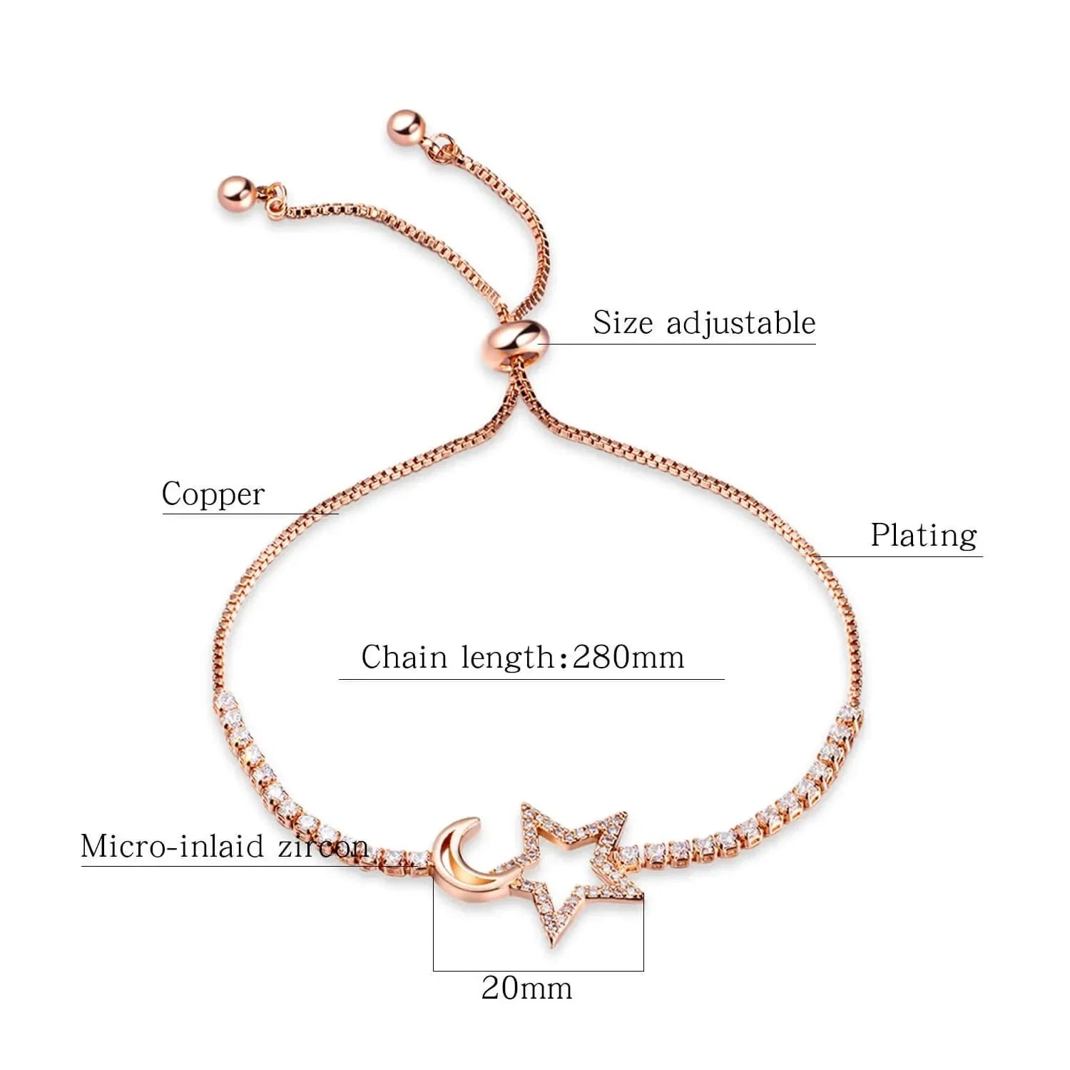 Raise your wrist in the celestial glory with our stunning Rose Gold Star & Moon Copper Bracelet. Composed meticulously and with a delicate hand, this bracelet is decorated charmingly features star motifs and moon in bright rose gold against the dazzling copper background. In addition, each component is imbued with a feeling of celestial radiance and fairy-like magic to add your outfit. A must-have for any occasion, this bracelet works in both casual and formal wear by adding a touch of celestial sparkle to your the overall look. Admire the beauty of the dark sky with our graceful Rose Gold Star & Moon Copper Bracelet, a timeless radio that intoxicates your eyes in the midnight.