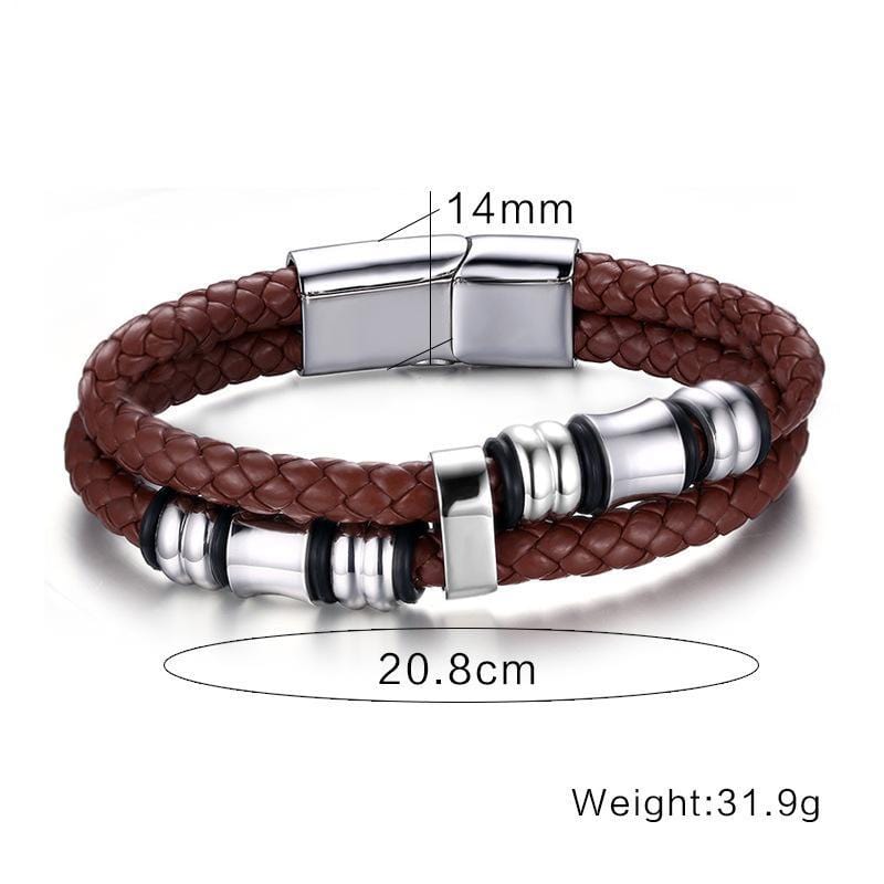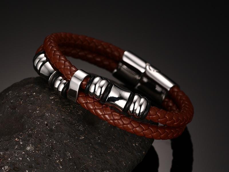 Steel Beads Brown Leather Bracelet