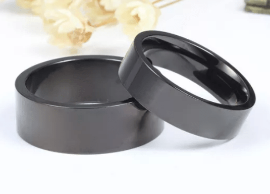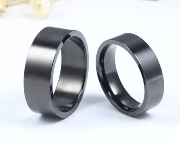 Add some edge to your big day with this beautiful set of charcoal tone wedding bands. The bands are crafted from black stainless steel with a modern, minimalist design. The mens ring is plain and simple while the women's ring features an emerald cut cubic zirconia held in a unique tension setting.