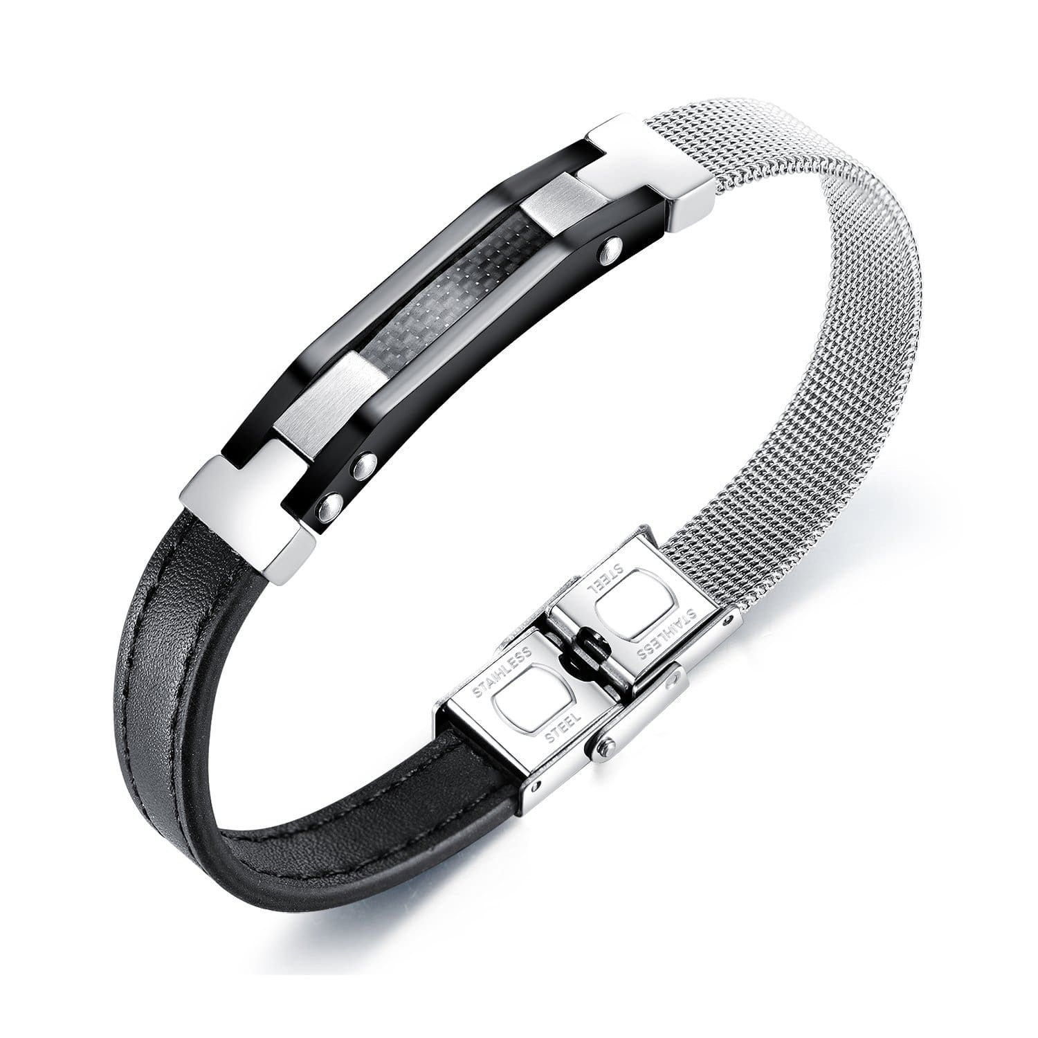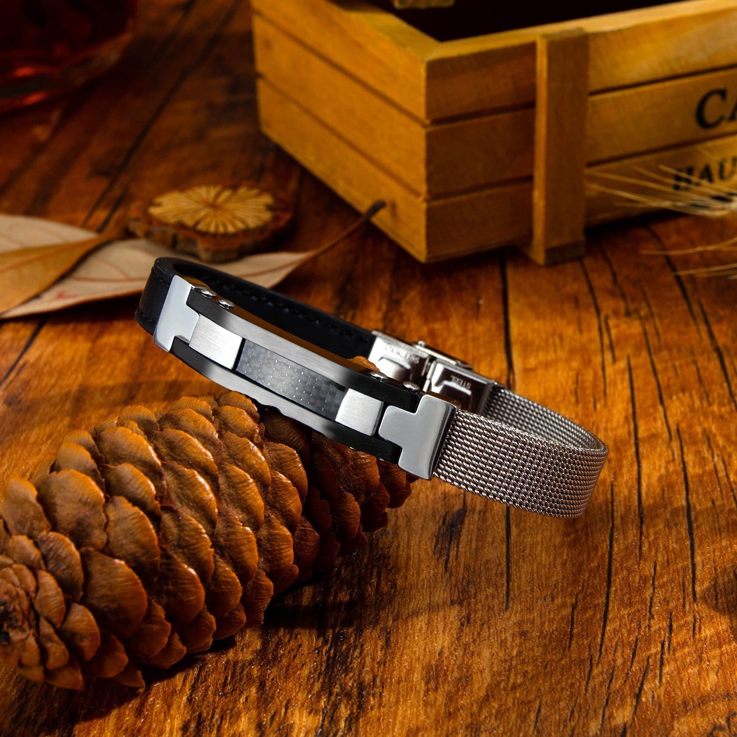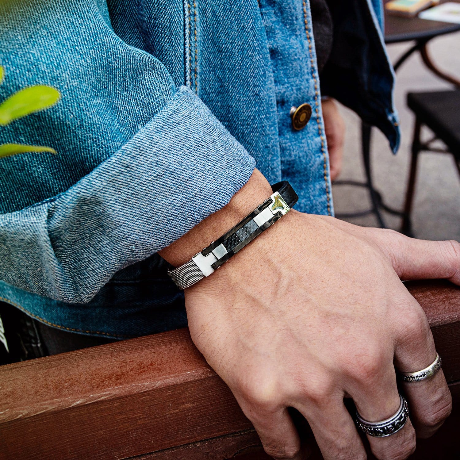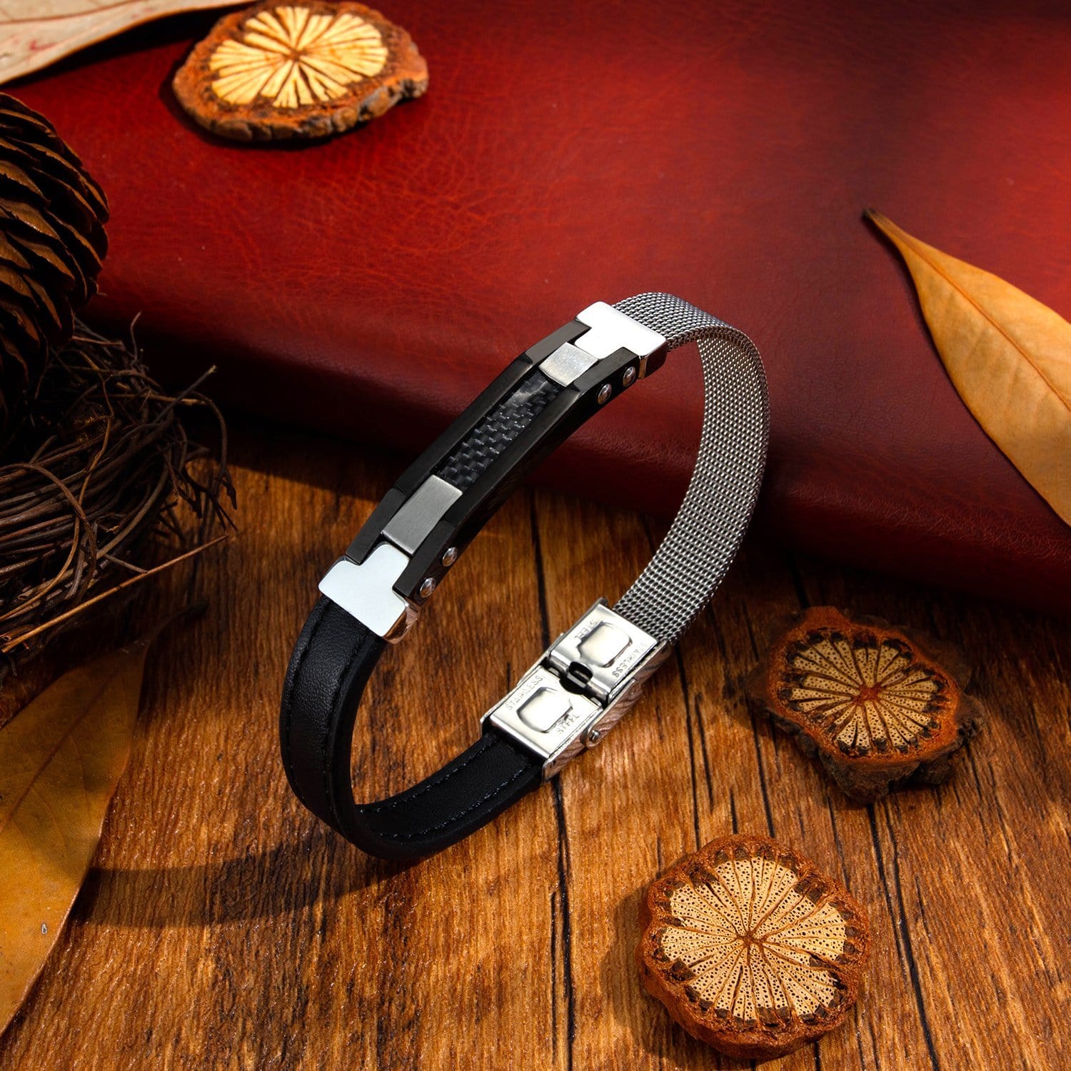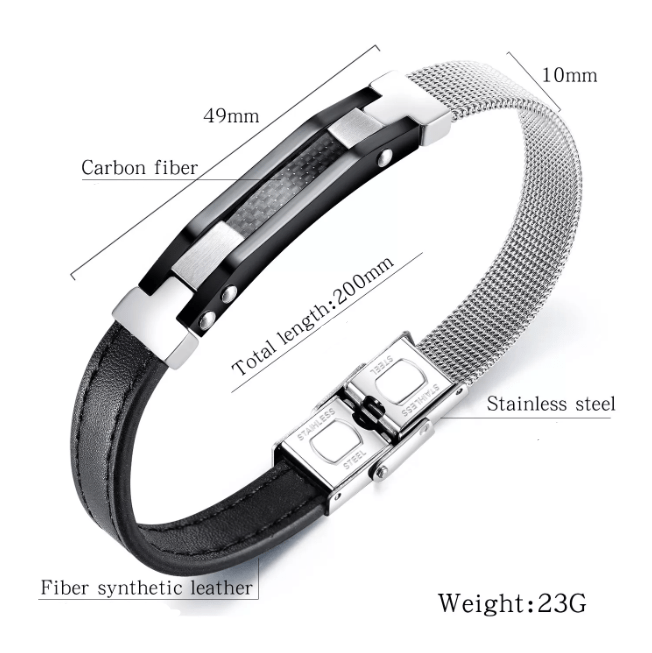 Steel Carbon Fibre Black Leather Bracelet Comes with an elegantly designed and sturdy gift box that is ideal for storing and presenting jewellery.